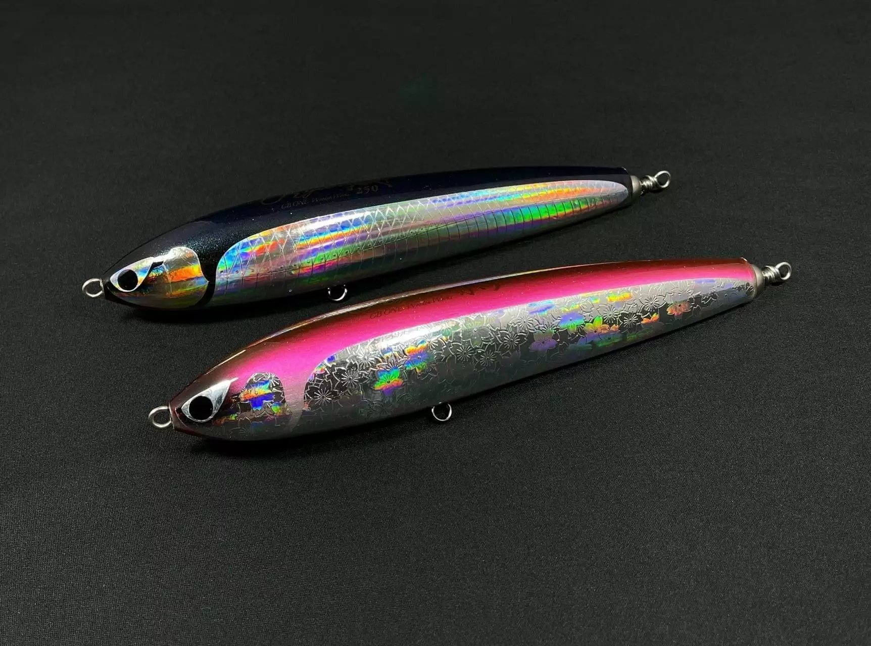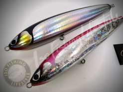 The CB One Ryan 250 stick bait is a work of art. These hand carved wooden lures feature a foil finish and a beautiful paint job. Designed to sit with its tail down at rest and create a nice bubble trail when pulled under the surface. The ‘S’ swimming action creates plenty of flash to imitate a fleeing bait fish. The Ryan 250F is an excellent lure for targeting GTs, Big Kingfish and Tuna. A must have lure for the enthusiast stick bait angler!!Â