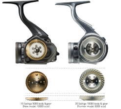 The larger diameter drive gear. Increasing the diameter by 12% and also increasing thickness reduces the amount of wear, including twist and deformation to both the drive & pinion gears. In comparison to 15 Saltiga, it is more than double the strength. New gear design combined with MQ body makes 20 Saltiga the pinnacle of saltwater spinning reels.