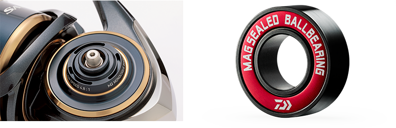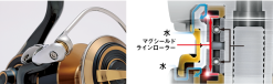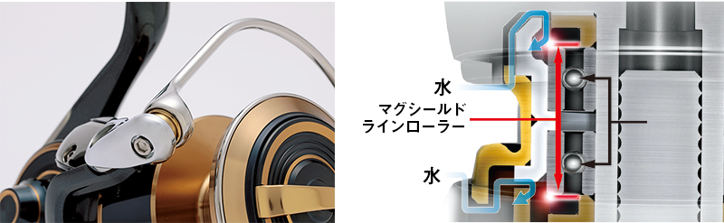 The line roller, which receives the seawater and sand directly picked up by the line, is one of the most severe parts of the reel. Such line rollers are also protected by the technology of magseal. Preventing the entry points and foreign matter greatly contributes to maintaining long term performance such as rotational feel and sensitivity. In addition, the improved rotation of the line rollers has reduced problems such as line breaking.