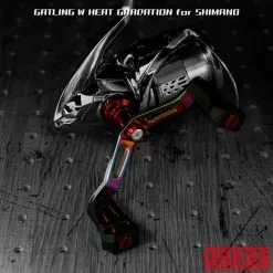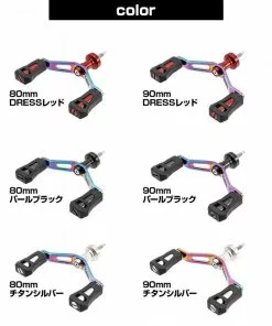 DRESS GATLING W Gatling Double Heat Gradation 90mm [SHIMANO] is a dedicated custom handle for Shimano spinning reels that can be mounted on both left and right side of reel. Made with “heat gradation” colour. The handle plate is a 3 mm thick molded rust resistant stainless steel and is a double handle equipped with a resin grip. This grip is a hybrid model of resin/ aluminum which reduces weight and has the same sensitivity as a metal grip although it is resin