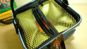 - 2 Zipper Construction. Main zipper which opens the whole bucket or a zipper which runs across the middle to make live baiting convenient