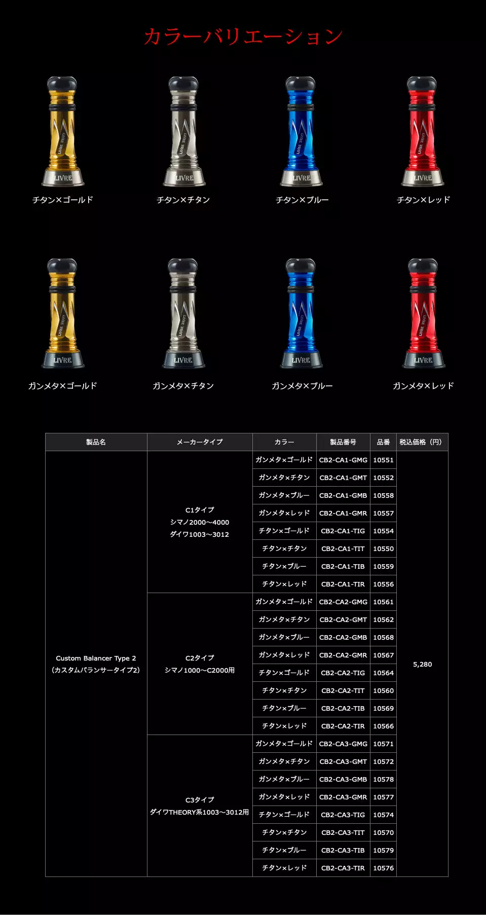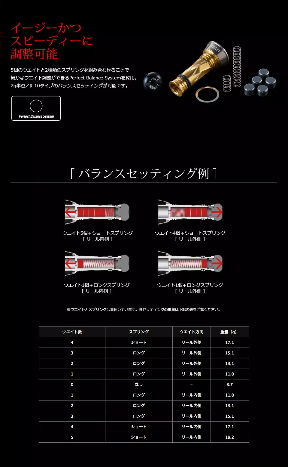 The Livre Custom Balancer comes with 5 weights and a spring which can be used to adjust the balance of the reel based on how you place them inside the balancer as shown in the photo.