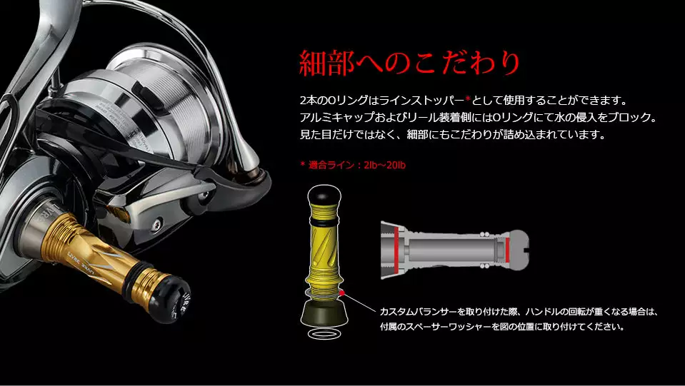 A custom balancer can be attached to the reel for the purpose of being of control the centre of gravity for the reel. It is a counter weight for the handle weight which leads to better balance and less wobble.