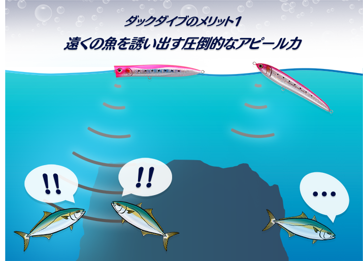 Duckdive has a slim shape and has a small caliber cup so that the angler can operate it without changing tackle balance. (For example first we use Rapido F230 and can change to Duckdive F230 with the same tackle.