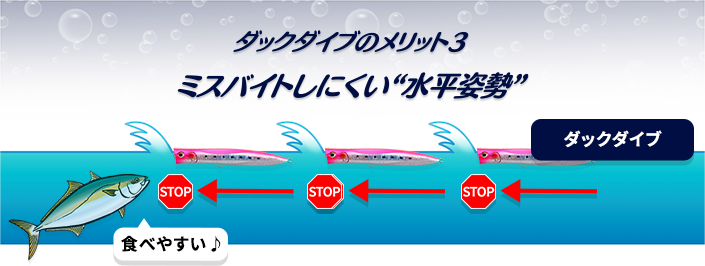 When making the rod action, the posture of Duckdive will keep nearly level due to the weight moving system. After making rod action, the position of normal poppers are not stable. This irregular movement sometimes makes the fish caution. As soon as we make a rod action, the small cup receives the water pressure and generates attractive bubbles. In addition to making bubbles, the moving distance is suppressed due to the water resistance.