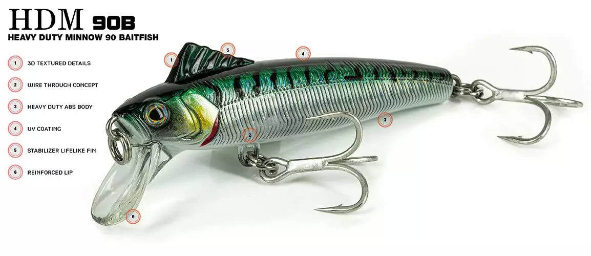 A compact and resistant lure made of reinforced ABS, and a stainless steel “wire through” construction. The high weight in relation to its volume allows it to easily reach considerable casting distances even in the most extreme situations, such as strong headwind. Thanks to the particular front dorsal fin, the internal weights partition, and the size of the lip this lure lends itself to quick retrievals. Its sinking action is very natural as well as its wobbling and the extraordinary rolling. These features make HDM90 a perfect bait for fishing on feeding frenzies or on the reefs.