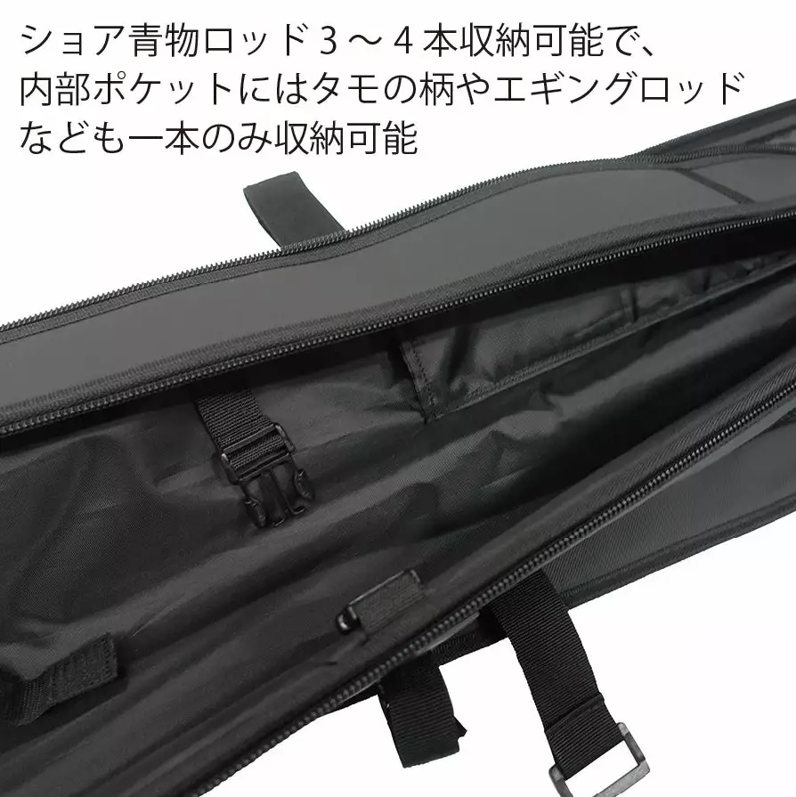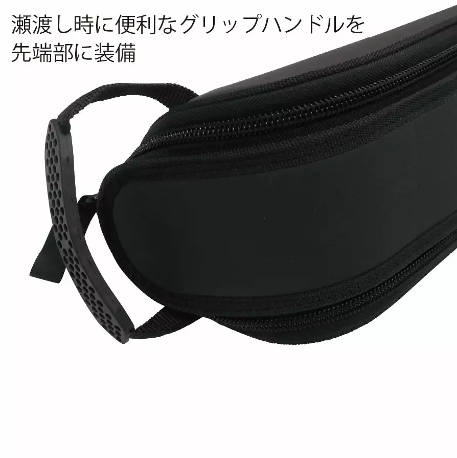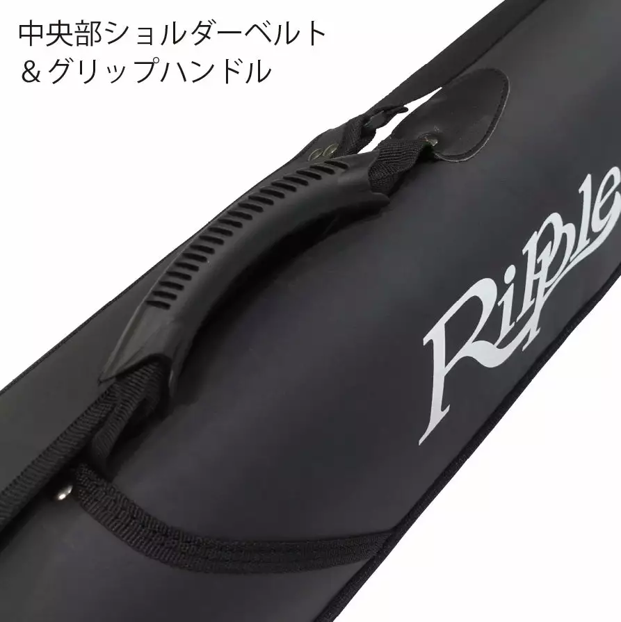 LAND BASE FISHING BAG is a rod bag for rock shore games. It has sufficient strength to withstand hard use when when boarding a ferry. It can store 3 to 4 rods with a closed size up to 1900 mm. (Example of Ripple Fisher Runner Exceed Final Standup, etc.) The inside is also equipped with a long pocket that can store sub-rods such as Ripple Fisher’s RF landing shaft, etc.) and eging rod. In addition to a grip handle and a shoulder strap that are convenient for handing over and moving luggage, there is also an external pocket and a fixing belt that allows you to fix the handle to the rod bag while wearing a gaff or net when changing. It is packed with external pockets that take into consideration the use of RF multi-shafts and specifications that are convenient for expeditions. It is a rod bag that is ideal for packing and protecting not only shore but also offshore casting models, and is useful in various situations.